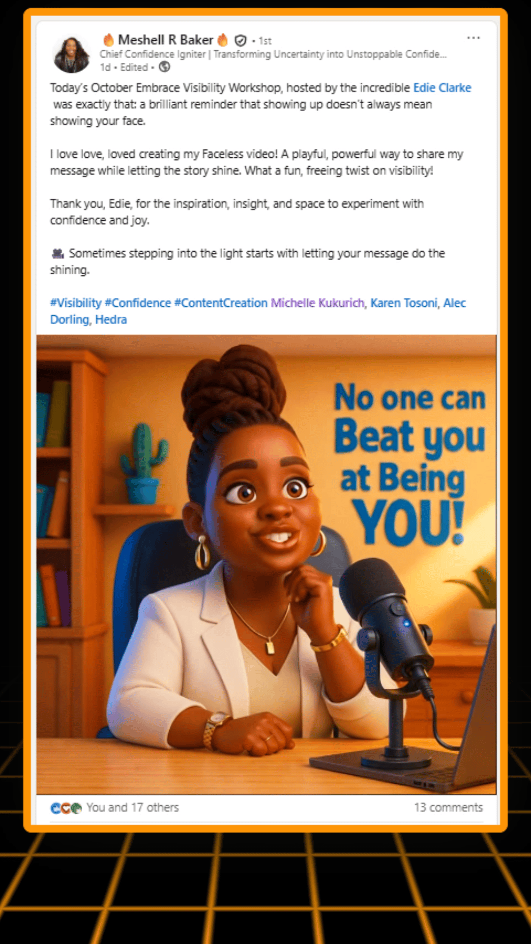 Hello Reader, Here’s a little truth for the camera-shy creators out there: You don’t have to be in every video for your audience to learn from you. My client Meshell Baker is a professional speaker, totally comfortable on stage, but when it came to recording videos, the camera felt heavier than any crowd. Click to Watch Then she discovered something powerful:People aren’t watching you.They’re watching what your message does for them. When she started using faceless videos, built with AI and...