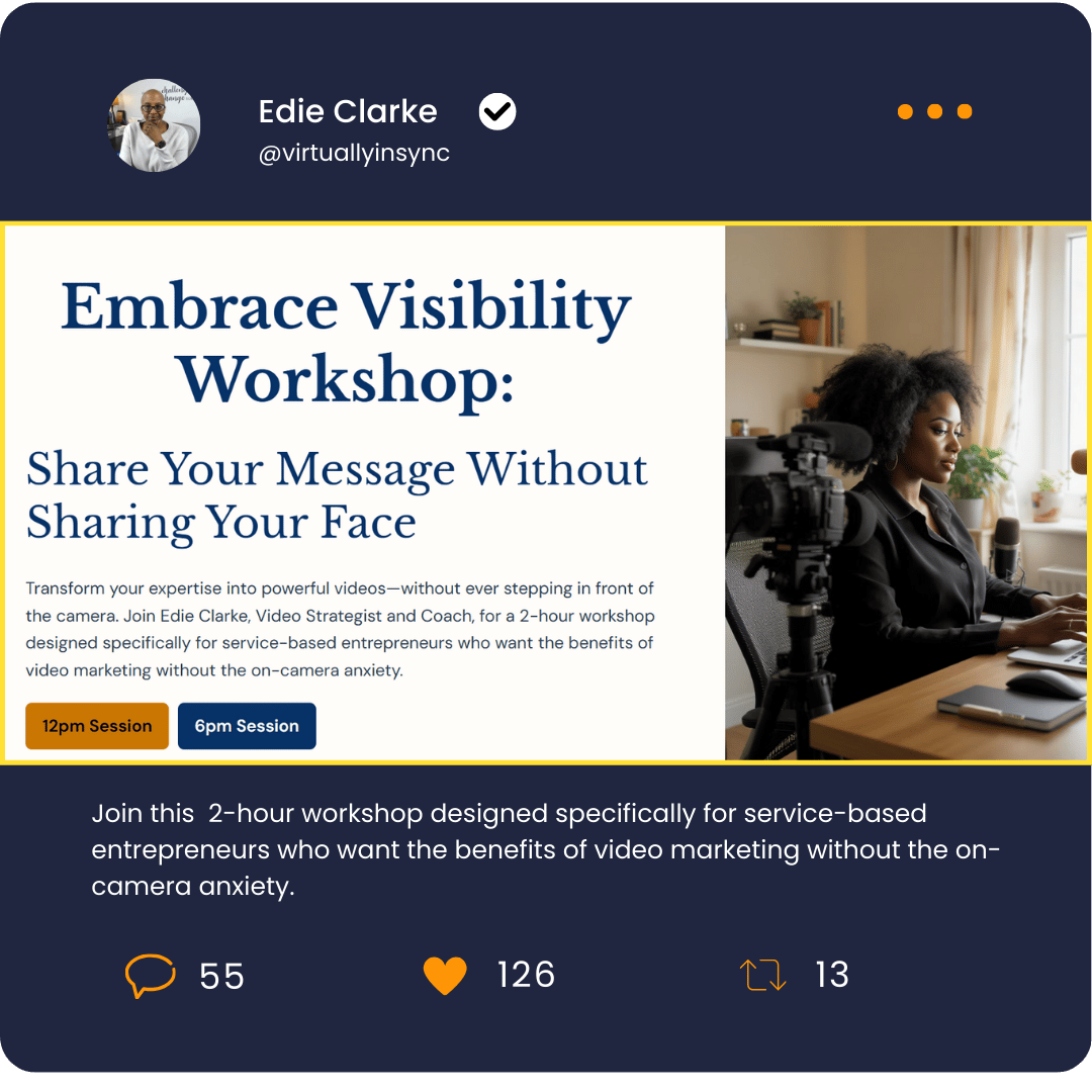 Hi, my name is Edie Clarke, and I'm an AI Video Strategist and Consultant who helps entrepreneurs, small businesses, and organizations use AI-powered video strategies to market their brands more efficiently and authentically. Through my Embrace Visibility workshops and upcoming video creation and marketing community, I empower entrepreneurs to create engaging, camera-free, and direct-to-camera videos using AI that build trust and drive results without the overwhelm. I also partner with organizations to integrate AI tools that streamline operations, enhance communication, and save valuable time. If this sounds like you or someone you know, let's set up a time to chat.